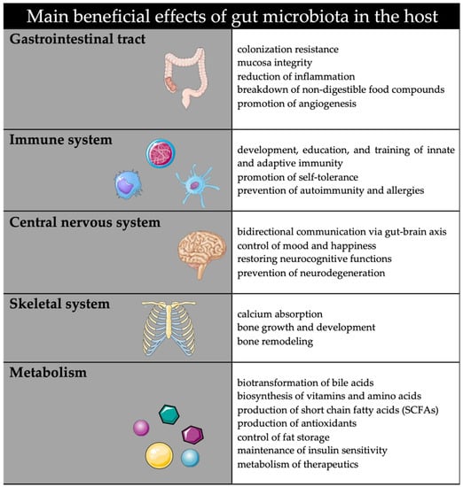 The term “microbiota” defines the entirety of microorganisms that reside in the organs and tissues of an individual acting mostly commensal or symbiotic []. The microbiota includes bacteria, archaea, fungi, and viruses, from which bacterial microbiota is the best characterized and most intensively studied component. While the human body hosts many trillions of bacteria, the gastrointestinal tract is the most densely colonized area, with bacterial concentrations ranging from 101–103 bacteria/gram tissue in the upper intestine to 1011–1012 bacteria/gram tissue in the colon [,]. Analyzing the ratio of intestinal bacterial phyla, Firmicutes (species, e.g., Clostridiales, Lactobacillus, Enterococcus) and Bacteroidetes (species, e.g., Bacteroides) make up the majority, with less dominance of the other phyla Actinobacteria (Bifidobacteria), Proteobacteria (Escherichia coli), Fusobacteria, and Verrucomicrobiota [,,]. In recent years, the human microbiota, especially the intestinal microbiota, has been recognized as having a major impact on human health, contributing to different physiological processes. The intestinal bacterial community is thought to participate in the metabolic, biochemical, and immunological balance of the host organism (summarized in Figure 1) [,,,].