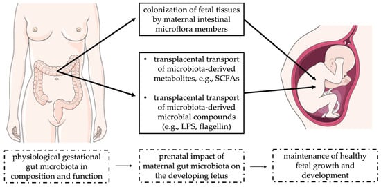 The second possible pathway of regulating fetal growth and development through the maternal intestinal microbiota is indirect. It is thought to be mediated by microbiota-derived metabolites that are transmitted transplacentally to the fetus [,,,]. These soluble factors are either synthesized endogenously by members of the microbiota or are metabolites of compounds that are taken up from the intestinal lumen.