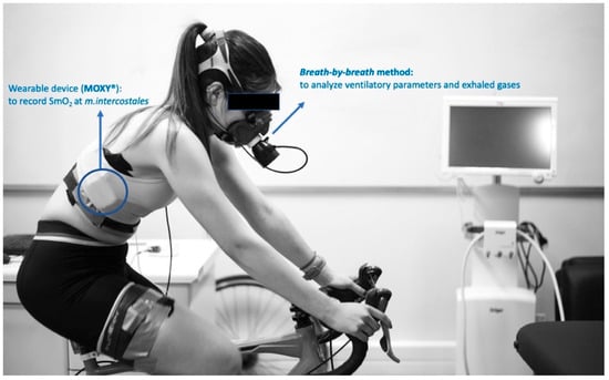 The assessment of oxygen saturation at muscular level (SmO2) has aroused growing interest to researchers in exercise physiology by the easy and not-expensive cost of the wearable devices that, by using the near-infrared spectroscopy (NIRS) principle, record the local changes of this parameter. Regarding, SmO2 has mainly been evaluated in locomotor muscles [12], showing good values for validity [13] and reliability [14,15]. Fontana et al. [16] found that the breakpoint at SmO2-m.vastus laterallis was associated with RCP in healthy participants during cycling exercise; and recently, Klusiewics et al. [17] determined that changes in SmO2-m.vastus laterallis are similar to maximal lactate steady-state in rowers. This evidence gives to SmO2 in locomotor muscles relevance and confidence to other traditional methods for prescribing exercise; however, this parameter can be conditioned by the energy demand of the respiratory muscles associated with the cost of breathing (COB) during exercise [18], a factor that varies among sports disciplines [19], and breathing patterns adopted during physical effort [20,21]. Considering that determination of VT is based on changes at ventilatory variables (mainly, lung ventilation (E)), it is relevant to know if changes at SmO2 of respiratory muscles (SmO2-RM) during exercise could help to determine training zones, and specifically the RCP. Our research group previously had been reported the good-to-excellent reliability of SmO2-RM measurements in long-distance runners [22], the impact associated with breathing patterns [21], and sex differences during exercise [23].
