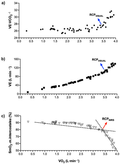 Another finding was regarding the changes of SmO2-m.intercostales during the exercise protocol. This data showed abrupt decreases while E increased exponentially, sustaining that an increase of recruitment of these muscle fibers implicates a decrease in oxygen levels in respiratory muscles. The changes of oxygen levels in respiratory muscles during our exercise protocol were similar to previous studies [16,20,21,22,23,24,25,34], recognizing this assessment as a novel and non-invasive method to estimate the cost of breathing (COB) or oxygen-uptake associated to the work of the respiratory muscles during exercise in athletes. Concerning, the COB at rest is near 2% of the total oxygen requirement in healthy adults [52], while during exercise, by the increase of E, it reaches 9 ± 3% of O2-máx. in trained subjects [53,54], 10–15% in inactive subjects [55], and 30–45% in patients with chronic respiratory diseases [56,57,58]. At exercise-time where RCPvisual was determined, the %SmO2-m.intercostales decreased between 10–15%, reaching a greater decrease at maximal stage (30–35%); these results are similar to exercise-time at the breakpoint in which SmO2-m.intercostales was found by the linear regression model used, and maximal stage (data not showed).