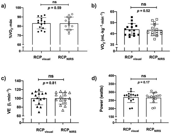 Comparison of each variable analyzed at RCP in both methods (visual and NIRS): (a) %O2-máx.: percentage of maximum oxygen-uptake; (b) O2 relative: oxygen-uptake expressed as a relative value (mL·kg−1·min−1); (c) E: lung ventilation (L); and (d) Watts: Load of ergometer.