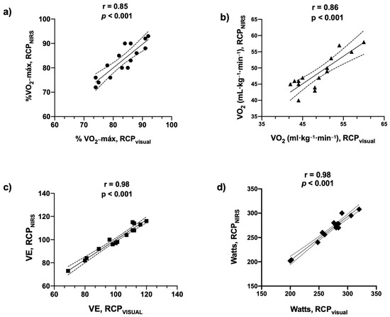 Associations of each variable analyzed at RCP in both methods (visual and NIRS): (a) %O2-máx.: percentage of maximum oxygen-uptake; (b) O2 relative: oxygen-uptake expressed as a relative value (mL·kg−1·min−1); (c) E: lung ventilation (L); and (d) Watts: Load of ergometer.