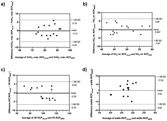 Plots of Bland-Altman tests of variables values at RCP in both methods (visual and NIRS): (a) %O2-máx.: percentage of maximum oxygen-uptake; (b) O2 relative: oxygen-uptake expressed as a relative value (mL·kg−1·min−1); (c) E: lung ventilation (L); and (d) Watts: Load of ergometer.