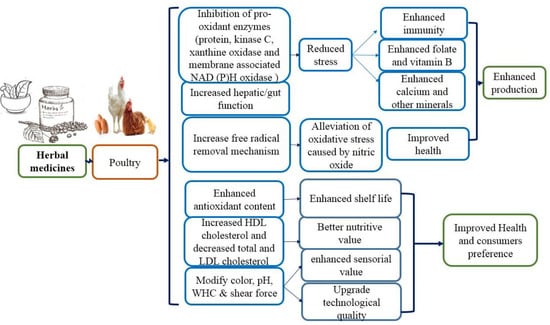 Herbal medicinal drugs as a feed additive have been given to poultry such as broiler, layer, local chicken, quails, ducks, and pet birds. Local chicken, i.e., village broiler, as well as layer, are kept in herds and daily offered the solution of herbs by drinking water to give a positive response for the better progress of the birds (low mortality, rare illness); as a result, the ammonia production around the cage is decreased. Race broilers, layer, and local poultry have been offered the mixture of medicinal plants as a feed additive, exhibiting the enhanced efficacy of feed and animal health [6]. Currently, there is an increasing awareness of the antiparasitic potential of herbal medicines. Medicinal plants are involved in combating parasitic diseases by decreasing stress, alleviating oxidative stress leading to better nutrients, improved health, and enhanced production (Figure 1). In this review, we seek to evaluate whether herbal medicines can be effective at controlling parasitic infections. Through value addition, traditional medicine information can be applied to clinical applications.