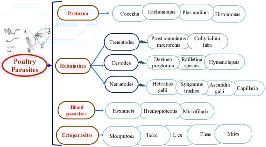 A number of parasitic insects and acarine species are externally infesting birds worldwide [78]. These parasites are known as ectoparasites. An ectoparasite is an organism that lives on the outer surface of its host and causes harm to it. The word “ektoparasite” is taken from the Greek word “ektos”, which means outside and “parasitos”, which means parasite [79]. These Ectoparasites include fleas, ticks, mites, mites, fleas, mosquitoes, blowflies, and blackflies. As a result, people and poultry suffer severe socioeconomic losses and illnesses, which are often caused by pathogens such as bacteria, fungi, viruses, nematodes, rickettsiae, spirochetes, and protozoa, all of which can cause highly dangerous zoonotic infections. Ticks are the most significant disease-causing arthropod vector, all other hematophagous arthropods can transmit a wide range of infections to humans and animals, including poultry, such as spirochetosis. Due to their extended feeding period, ticks represent an extreme example of evading their host’s immune response and hemostatic defense, thus becoming the best pathogen spreaders among all known arthropods. In ticks, digestive enzymes are deficient which may explain why ticks spread more pathogens than other hematophagous arthropods [80].