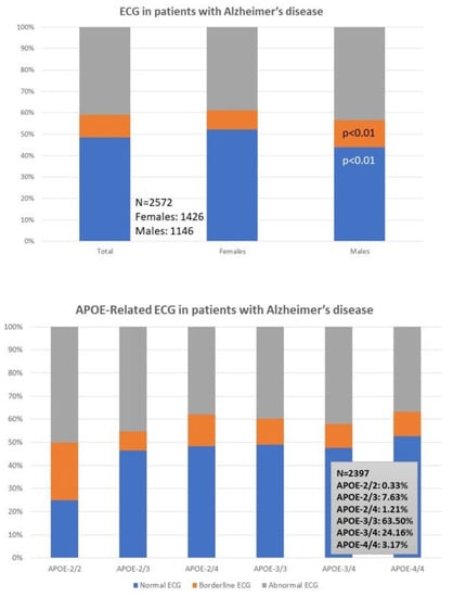 ECG is abnormal in 40% of the patients (38% F; 43% M). A normal ECG is found more frequently in females (52%) than males (43%; p < 0.01), and a borderline ECG appears more frequently in males (12%) than in females (9%; p < 0.01) (Table 1; Figure 1, upper panel); however, these differences are unrelated to apolipoprotein E (APOE) variants in both sexes (Figure 1, lower panel). Despite this global perception, and considering the small number of cases with the APOE-2/2 and APOE-4/4 genotypes, APOE-4/4 carriers show abnormal ECGs (52%) more frequently than APOE-3/3 carriers, especially in males (36%) as compared to females (10%); in contrast, homozygous APOE-2/2 carriers exhibit the lowest frequency of abnormal ECG in the whole sample (25%), with twice the number of men (50%) showing abnormal ECG than APOE-2/2 females (25%) (Figure 1, lower panel).