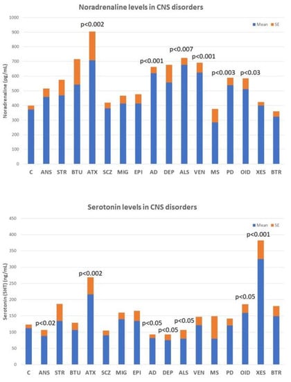 Noradrenaline (upper panel) and serotonin levels (lower panel) in central nervous system disorders. C: Control; ANS: Anxiety; STR: Stroke; BTU: Brain tumors; ATX: Ataxia; SCZ; Schizophrenia and psychosis; MIG: Migraine; EPI: Epilepsy; AD: Alzheimer’s disease; DEP: Depression; ALS: Amyotrophic Lateral Sclerosis; VEN: Vascular encephalopathy; MS: Multiple Sclerosis; PD: Parkinson’s disease; OID: Organic Intellectual Disability; XES: Xenoestrogenic syndrome; and BTR: Brain trauma.