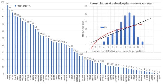 Frequency of defective pharmagene variants in Alzheimer’s disease and average accumulation of dysfunctional variants per patient.