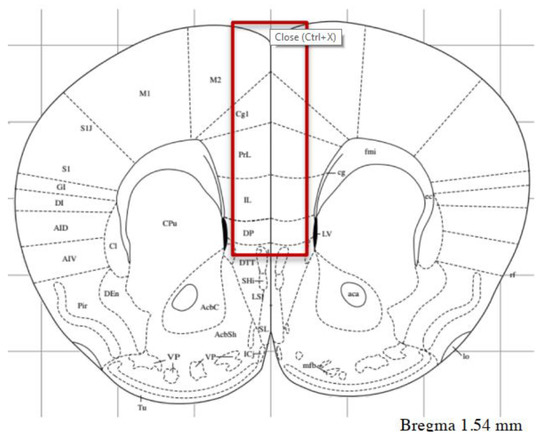 Thirty minutes after the last behavioral session, all animals were pretreated with lithium chloride (LiCl) (100 mg/kg i.p.) (Sigma-Aldrich, Milan, Italy), a dose that was expected to increase receptor agonist-stimulated InsP formation due to lithium’s ability to inhibit the conversion of InsP into free inositol [34]. Mice were given PAM VU0360172 (30 mg/kg) or vehicle one hour after being treated with lithium chloride. One hour after drug (VU0360172 or vehicle) injections, mice were killed by decapitation, and the prefrontal cortex, dorsal, and ventral hippocampus were quickly dissected and stored at −80 °C until InsP measurements and western blot analysis (See Figure 1 for the experimental diagram and Figure 2 for a schematic representation of prefrontal cortex dissection). Lithium chloride was dissolved in saline and VU0360172 (Tocris Bioscience, United Kingdom) was dissolved in 10% Tween 80 and adjusted to pH 7.4 with NaOH. Drugs and vehicles were administered i.p. in a volume of 5 mL/kg body weight. The dose used for VU0360172 (30 mg/kg) was selected on the basis of our previous data [31].