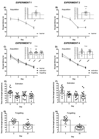 Two days after the probe trial, the extinction groups (from experiments 3 and 4) were forced to extinguish the acquired memory by performing two non-reinforced trials (without platform) for three consecutive days (days 6–8). In both experiments, about half of the animals successfully extinguished the formerly acquired hidden platform task. As shown in Figure 3E,F, these animals showed a significant reduction in the time spent in the target quadrant (<15 s), indicating a loss of their preference for the target quadrant, which was clearly evident during the probe trial (day 5).