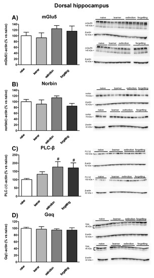 Western blot analysis of mGlu5 receptors, the α subunit of Gq protein (Gαq), phospholipase-Cβ (PLC-β), and the mGlu5 receptor-interacting protein, norbin was carried out in the dorsal and ventral hippocampus homogenates used for the assessment of PI hydrolysis of 7 mice randomly selected from naive, learner, extinction, and forgetting groups. An aliquot of tissue extract was mixed with a cocktail of protease inhibitors (Sigma-Aldrich, Cat. 2714) and after protein determination, protein lysates (40 μg) were separated by SDS-PAGE electrophoresis and dried on nitrocellulose. The upper part of the membrane was probed with a polyclonal anti-mGlu5 receptor (Abcam, Waltham, MA, USA, Cat. AB76316, dilution 1:5.000), anti-norbin antibody (Abcam, Waltham, MA, USA, Cat. AB88877, dilution 1:700) or anti-phospholipase-Cβ (Santa Cruz, Dallas, TX, USA, Cat. SC5291, dilution 1:1000). The lower part of the membrane was probed with anti-β-actin (Sigma-Aldrich, Cat. A2228, dilution 1:1000) and anti-Gαq (Santa Cruz, USA, Cat. SC136181, dilution 1:500) monoclonal antibodies. Protein expression was detected by the chemiluminescence (ECL) system, visualized with ChemiDoc XRS (Bio-Rad, Hercules, CA, USA) and analyzed by using ImageJ2 2.3.0 software (NIH, Bethesda, MD, USA).