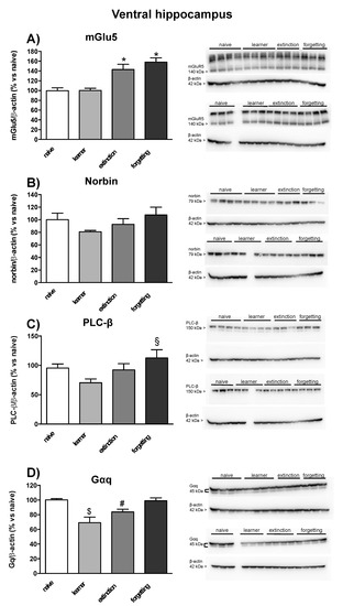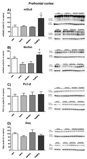 In seven mice randomly selected from the naive, learner, extinction, and forgetting groups, we examined protein levels of the mGlu5 receptor, the α subunit of Gq protein (Gαq), phospholipase-Cβ (PLC-β), and the mGlu5 receptor-interacting protein, norbin, in the dorsal and ventral hippocampus and in prefrontal cortex. No significant changes in mGlu5 receptor protein levels were found in learner mice in the three brain regions as compared to naive mice. However, mGlu5 receptor protein levels were significantly enhanced in the ventral hippocampus in the extinction and forgetting groups (only a trend towards an increase was observed in the dorsal hippocampus) (Figure 5A and Figure 6A) and in the prefrontal cortex in the forgetting group (Figure 7A). No significant changes in norbin protein levels were found in the four groups (Figure 5B and Figure 6B) in the dorsal and ventral hippocampus, but an increase was observed in the prefrontal cortex of the forgetting group with respect to the learner and extinction groups (Figure 7B). Interestingly, the PLC-β levels showed an increase in the extinction and forgetting groups as compared to naive mice in the dorsal hippocampus (Figure 5C) and were significantly enhanced in the forgetting group vs. the learner group in the ventral hippocampus (Figure 6C). Finally, the Gαq protein levels were unchanged in the dorsal hippocampus (Figure 5D), whereas in the ventral hippocampus, they were significantly lower in the learner group, as compared to all other groups. Levels were significantly lower in the extinction group as compared to the naive group (Figure 6D). No differences in the PLC-β and Gαq protein levels were found between the four groups in the prefrontal cortex (Figure 7C,D). Uncropped images of blots are shown in Figure S1. The original Western Blot figures can be found at Figure S1.