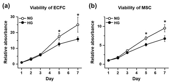 The cell viability of the ECFCs and MSCs was determined by a 3-(4,5-dimethylthiazol-2-yl)-2,5-diphenyltetrazolium bromide (MTT) assay. The ECFCs or MSCs cultured in NG or HG for 7 days were harvested and added to a 96-well plate at 0.1 × 104/100 μL/well, with each growth medium containing HG or NG. On days 1, 2, 3, 5, and 7, the cells were supplemented with MTT (0.5 mg/mL; Sigma-Aldrich, St. Louis, MO, USA) and incubated for 4 h. The formazan was dissolved with dimethyl sulfoxide (DMSO; Sigma-Aldrich), and the absorbance was measured at 650 nm. Quantitative graphs were made using the relative absorbance, which was calculated by dividing the absorbance of every other time point by the absorbance of NG on day 1.