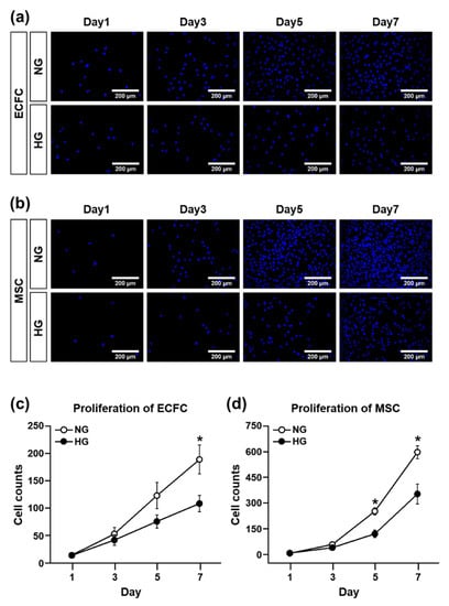 The proliferation ability of the ECFCs and MSCs were evaluated by counting 4′,6-diamidino-2-phenylindole (DAPI)-stained cells. The use of DAPI—a fluorescent stain that binds strongly to A-T-rich regions in DNA—is a traditional experimental protocol to count cells, even though many other alternatives to DAPI staining have been suggested recently. The ECFCs were seeded in a 24-well plate at a concentration of 0.4 × 104/600 μL/well (the MSCs were seeded at a density of 0.2 × 104/600 μL/well) and allowed to attach overnight at 37 °C. After 1, 3, 5, and 7 days of NG or HG treatment, the medium was removed and the cells were fixed with a 10% formalin solution (Sigma-Aldrich) for 30 min at room temperature. After fixation, the cells were washed one time with 1X phosphate-buffered saline (PBS; Corning, NY, USA), and then the mounting medium containing DAPI (Vectashield with DAPI; Vector Laboratories, Burlingame, CA, USA) was dropped into the middle of the well for nuclear staining. The DAPI-stained cells in images randomly taken per group from several independent experiments were counted using ImageJ software (NIH, Bethesda, MD, USA).