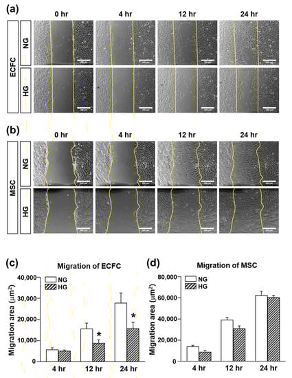 The migratory function of the ECFCs and MSCs was evaluated by a scratch wound migration assay. The ECFCs or MSCs cultured in NG or HG for 7 days were harvested and added to a 24-well plate (ECFCs: 30 × 104/1 mL/well; MSCs: 20 × 104/1 mL/well) with each growth medium containing NG or HG. The cells were incubated at 37 °C for 16 h to allow the cells to attach to the bottom. After 16 h of incubation, the medium was changed to FBS-free medium containing NG or HG for serum starvation. After 16 h of incubation for serum starvation, the cell monolayer was scraped with a 200 uL pipette tip to generate scratch wound. The cells were rinsed with FBS-free medium to remove any floating debris. The scratch wound area was monitored at 0, 4, 12, and 24 h with an inverted microscope-connected camera (Koptic, Yongin, Gyeonggi-do, Korea). The magnitude of migration was evaluated by measuring the area of migrated cells (ImageJ software).
