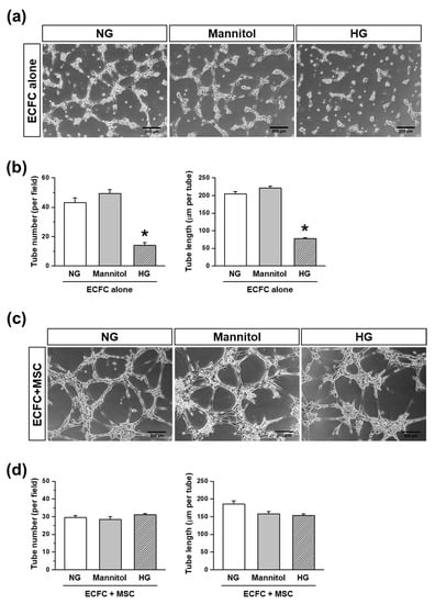 A tube formation assay was performed to determine the capability of the ECFCs to form a tubular structure in the absence or presence of MSCs. A 24-well plate was coated with ice-cold Matrigel solution (Phenol Red-Free; BD biosciences) and incubated at 37 °C for at least 30 min to allow the Matrigel to solidify. The ECFCs and MSCs cultured in each growth medium containing HG or NG for 7 days were harvested. ECFCs alone or ECFCs+MSCs were suspended in FBS-reduced medium (1%) containing NG, HG, or mannitol (30 mM; an osmatic control for HG), then added to the Matrigel-coated 24-well plate at a total of 15 × 10