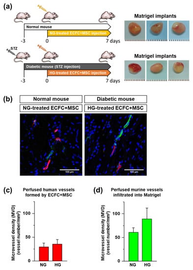 To determine the in vivo vasculogenic capacity of human ECFCs+MSCs under diabetic conditions, we implemented a xenograft model with STZ-induced diabetic immunodeficient mice. The ECFCs and MSCs cultured in NG or HG for 7 days were harvested. The ECFCs and MSCs were mixed and suspended in ice-cold Matrigel (total 2.0 × 106/150 μL). The ratio of ECFCs and MSCs in the combination was 3:2 (1.2 × 106:0.8 × 106). The ECFC+MSC-suspended Matrigel solution was injected subcutaneously into the dorsal area of a mouse using 25-gauge needle. The HG-treated ECFCs+MSCs were injected into the diabetic mice, and NG-treated ECFCs+MSCs were injected into normal mice. After 7 days, the perfused blood vessels formed by ECFCs+MSsC within the Matrigel implants were fluorescently labeled by the in vivo staining method, and then the Matrigel implants were harvested to analyze the perfused microvessel density.