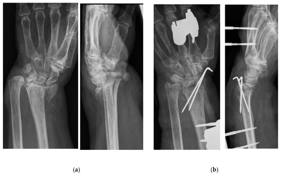 - Froschauer, S.M.; Holzbauer, M.; Hager, D.; Kwasny, O.; Duscher, D. Proximal Row Carpectomy with Total Scapoidectomy vs. Conventional Carpal Resection for ReMotion Total Wrist Arthroplasty. J. Clin. Med. 2021, 10, 1865. [Google Scholar] [CrossRef]