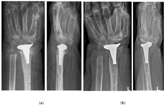 - Boeckstyns, M.E.H.; Herzberg, G. Periprosthetic osteolysis after total wrist arthroplasty. J. Wrist Surg. 2014, 3, 101–106. [Google Scholar] [CrossRef] [Green Version]