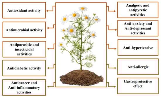 Pharmacological investigations reported that M. chamomilla has several biological activities (Figure 1). The antioxidant activity of EO and extracts was investigated using several tests. Moreover, enzyme activities of extracts were assessed for catalase, acetylcholine esterase, glutathione, peroxidase, ascorbate peroxidase, and superoxide dismutase. In addition, the antioxidant activity determined in cell suspension culture [19], extracts from waste after chamomile processing [20], and polyphenolic–polysaccharide conjugates [21] was investigated. On the other hand, M. chamomilla exhibited an antibacterial potential against Gram-positive and Gram-negative bacteria. In addition, the effect of M. chamomilla EO on Pseudomonas aeruginosa biofilm formation and alginate production was investigated [22]. The plant also showed activity against antibiotic-resistant bacteria, including Staphylococcus aureus MRSA [23,24] and multidrug-resistant P. aeruginosa [25]. Moreover, M. chamomilla extract exhibited an anti-adherence activity against several bacterial strains [26]. On the other hand, M. chamomilla EO and extracts exhibited antifungal activity against several fungal strains, especially against Candida sp. and Aspergillus sp. Generally, M. chamomilla’s effect on oxidative stress, bacterial, and fungal strains varied depending on several factors, including plant origin, organ used, extraction solvent, and technique. In addition, M. chamomilla exhibited antiparasitic, insecticidal [27,28], anti-diabetic [29], anticancer [30,31], and anti-inflammatory activities [32] (Figure 1).