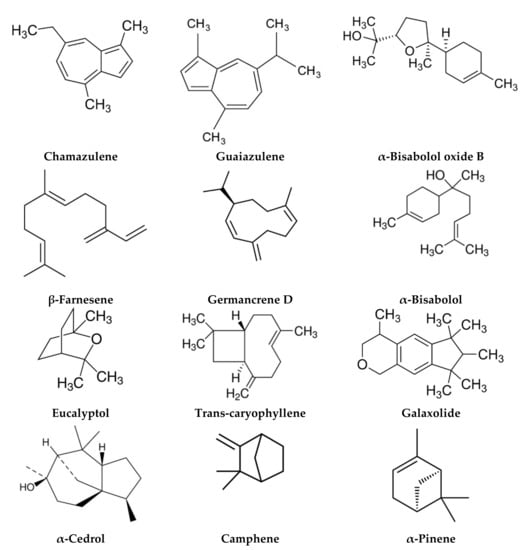 The phytochemical composition of M. chamomilla essential oil (EO) and extracts has been reported, with over 120 constituents identified. In general, terpenoids formed the most important compound group in M. chamomilla EO, with the most important compounds being bisabolol and its oxides A and B, bisabolone oxide A, chamazulene, and β-farnesene (Figure 2). This composition is influenced by several factors, such as the geographic regions and environment [9,10], plant cultivars [11], and genetic factors [12]. Other factors related to the drying techniques [13], extraction techniques [14], salicylic acid concentrations [11], and the use of cyanobacterial suspensions as bio-fertilizers [15] can also influence EO chemical composition. On the other hand, M. chamomilla extracts were dominated by phenolic compounds, including phenolic acids, flavonoids, and coumarins. In addition, the amino acid composition has also been studied [16]. Their chemical composition of coumarin, phenolic acid, and flavonoids contents was influenced by treatment with ethephon [17], cadmium, and copper [18].