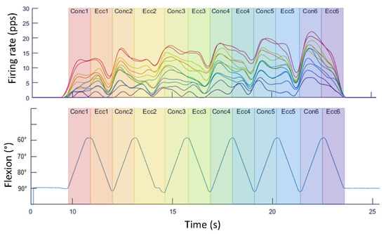 - De Luca, C.J.; Hostage, E.C. Relationship Between Firing Rate and Recruitment Threshold of Motoneurons in Voluntary Isometric Contractions. J. Neurophysiol. 2010, 104, 1034–1046. [Google Scholar] [CrossRef]