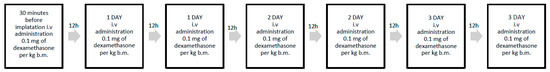 Each subgroup underwent a different steroid scheme of administration. In the first subgroup, dexamethasone was administered intravenously (0.1 mg per kg of body weight) 30 min before the cochlear implant surgery and for three consecutive days every 12 h (Figure 2). In the second subgroup, prednisone was administered orally (1 mg per kg of body weight) three days prior to surgery. Then, 30 min before implantation surgery, dexamethasone at a dose of 0.1 mg per kg body weight was administered intravenously (i.v.). For the subsequent three days, prednisone was administrated orally (1 mg of prednisone per kg body weight). After this time, the dose was reduced by 10 mg per day (Figure 3).