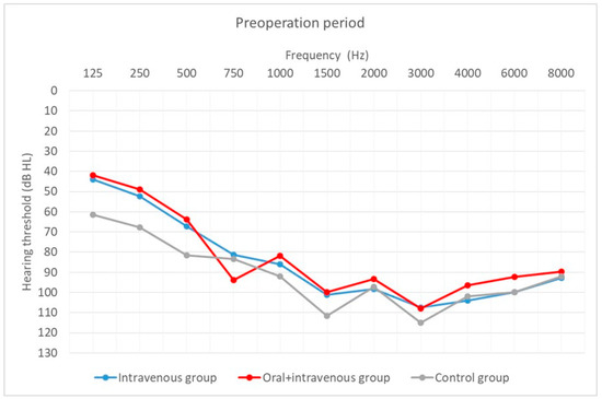 Mean hearing thresholds in the preoperative period according to treatment regime.