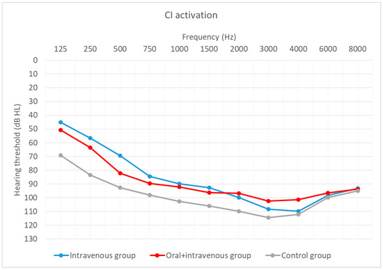 Hearing thresholds before implantation in the patients in all three groups were similar (H = 5.60; p = 0.061). In the activation period, hearing thresholds differed significantly (H = 7.86; p = 0.002). A difference was found between the oral + i.v. and the control group (U = 29.50; p = 0.005).