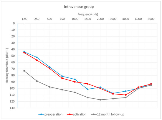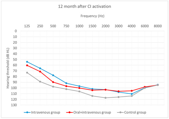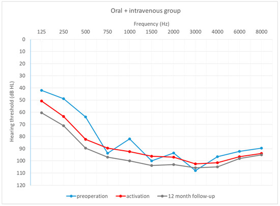 As far as the results of this study are concerned, the hearing thresholds before implantation in the patients in the three groups were similar. In the activation period, hearing the thresholds differed significantly. A difference was found between the oral + i.v. and the control group. Twelve months after activation, the outcomes again differed. Additional comparisons revealed slight differences between the intravenous and the control group and between the oral + i.v. and the control group. Hearing thresholds pre-operation and 12 months after CI activation within each group were compared. In the intravenous group, the mean preoperative outcomes worsened by about 9 dB to M = 91.06 (SD = 9.92), which was statistically significant. In the oral + i.v. group (the second subgroup), the mean difference between pre-op and 12-month outcomes was about 16 dB, and again the difference was statistically significant. In the control group, the deterioration was also about 14 dB and was statistically significant.