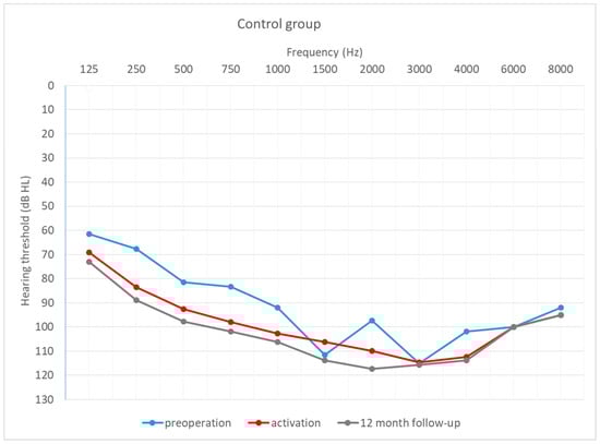 Figure 4, Figure 5 and Figure 6 depict the mean hearing thresholds across all 11 frequencies (0.125–8 kHz) in the preoperative period, at CI activation, and 12 months after CI activation.