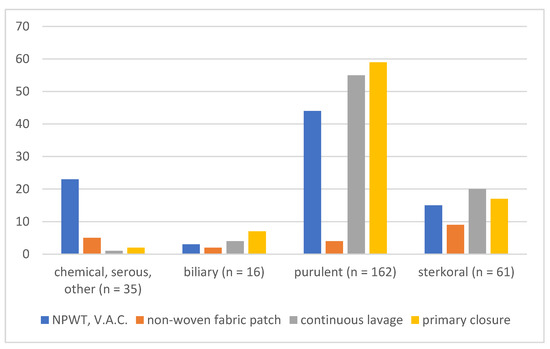 Serous, chemical, and other peritonitis (1) was present in 35 patients, biliary peritonitis (2) in 16 patients, purulent peritonitis (3) in 162 patients, and stercoral peritonitis (4) in 61 patients (Figure 2).