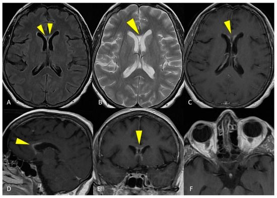 MRI of the brain. Axial T2-weighted and FLAIR images show curve hyperintense lesions affecting the ependymal surface of frontal horns of the lateral ventricles and corpus callosum just near the genu, with a symmetrical pattern (A,B). These sub-ependymal lesions show homogeneous enhancement on the T1-weighted post-gadolinium image (C–E). No optic nerve enhancement on T1-weighted post-gadolinium images was present (F).