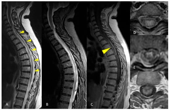- Lee, M.J.; Aronberg, R.; Manganaro, M.S.; Ibrahim, M.; Parmar, H.A. Diagnostic Approach to Intrinsic Abnormality of Spinal Cord Signal Intensity. Radiographics 2019, 39, 1824–1839. [Google Scholar] [CrossRef]