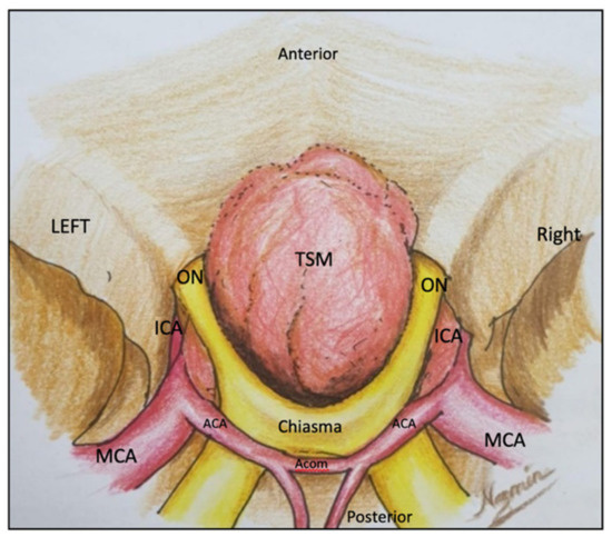 - Lee, S.; Hong, S.H.; Cho, Y.H.; Kim, J.H.; Kim, C.J. Anatomical origin of tuberculum sellae meningioma: Off-midline location and its clinical implications. World Neurosurg. 2016, 89, 552–561. [Google Scholar] [CrossRef] [PubMed]