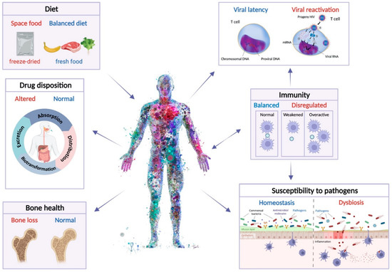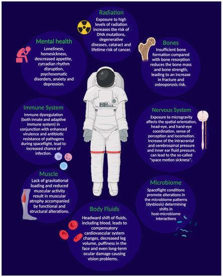 It is apparent that the space environment imposes several challenges to human physiology. Specific space environment factors, such as microgravity and radiation, are thought to also induce changes in microbiome composition (i.e., dysbiosis) [89], which may alter host–microbe interactions and adversely affect immune function and metabolism, thereby representing a risk to astronaut health, especially during long-term spaceflight missions.