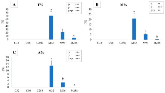 Mean values and relative standard errors of the colonization frequency F% (A), colonization intensity percentage M% (B), and percentage of arbuscule abundance A% (C) in A. annua plants grown at different P levels. C32, C96, and C288: uninoculated plants grown at 32, 96, and 288 µM of phosphate, respectively; M32, M96, and M288: plants inoculated with F. mosseae and grown at 32, 96, and 288 µM of phosphate, respectively. Different letters indicate significant differences between the various treatments. A two-way ANOVA is present in the inset of each graph and considers the two factors phosphatic nutrition (P) and fungus (F) and their interaction (F * P). * p < 0.05; ** p < 0.01; *** p < 0.0001.