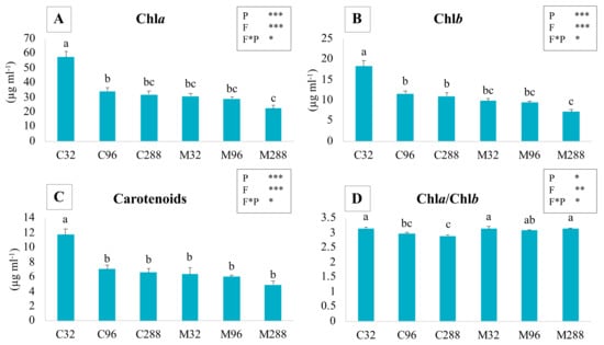 The graphs report the mean values and the relative standard errors of chlorophyll a (Chla—(A)), chlorophyll b (Chlb—(B)), and carotenoid concentration (C), besides the Chla/Chlb ratio (D) in the leaves of A. annua plants grown at different P levels. C32, C96, and C288: uninoculated plants grown at 32, 96, and 288 µM of phosphate, respectively; M32, M96, and M288: plants inoculated with F. mosseae and grown at 32, 96, and 288 µM of phosphate, respectively. Different letters indicate significant differences between the various treatments. Moreover, a two-way ANOVA is presented in the inset of each graph and considers the two factors phosphatic nutrition (P) and fungus (F) and their interaction (F*P): ns not significant; * p < 0.05; ** p < 0.01; *** p < 0.0001.