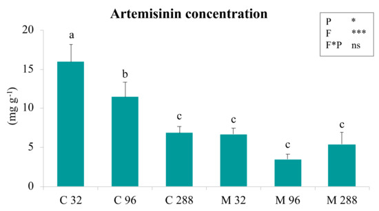 In C plants, the artemisinin concentration in leaves (Figure 3) proportionally decreased when P concentration increased in the substrate, with significant differences within all the C treatments. The P factor was responsible for this observed trend (two-way ANOVA). C32 and C96 plants presented the highest artemisinin abundance. These two plant treatments were significantly different from all the others. Irrespective of the P level, no significant differences were recorded in M plants, although a little decrease in artemisinin concentration was observed in M96 plants. Inoculated plants were quite similar to controls grown at 288 µM of phosphate. The fungus factor (F) was the main variable determining a low artemisinin concentration in the inoculated plants, as underlined by the two-way ANOVA.