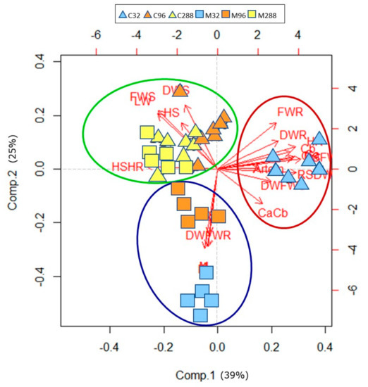 PCA of all plant growth parameters, photosynthetic pigment, and artemisinin concentration of A. annua plants grown at three different P levels (32, 96, and 288 μM) and inoculated (M) or not (C) with F. mosseae BEG 12. Plants of each group are indicated by different geometrical colored forms: C32 (light-blue triangle), C96 (orange triangle), C288 (yellow triangle), M32 (light-blue square), M96 (orange square), and M288 (yellow square). The three colored circles identify the groups described in the text (red: group 1; blue: group 2; green: group 3).