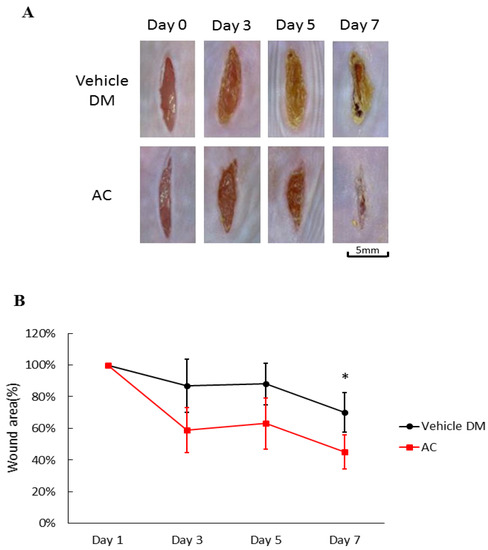 Effects of Antrodia cinnamomea (AC) ointment on linear cutaneous diabetic wound. (A) Full-thickness wounds were induced for vehicle or Antrodia cinnamomea treatment in diabetic mice. Images of representative mice from each group taken on post-surgery days are shown. (B) Mean wound area at indicated time points in each group show that healing rate in linear wound healing in diabetic mice. Each value represents the mean ± SEM; n = 6 for each group. * p < 0.05 when AC group compared to vehicle group.