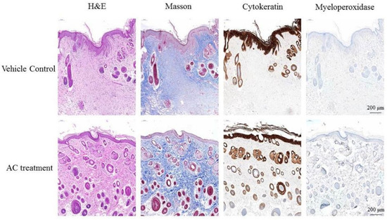 The effect of AC on wound inflammation was presented by the physical appearance of the healing wounds at day 7. By use of hematoxylin-eosin staining and observed under 400× magnification, the wound site appears as an open wound with mild epithelial hyperplasia. There were also some infiltrating cells surrounding the peripheral tissues of the wound (Figure 3). The result of Masson Trichrome stain showed that collagen fibers of control group stained blue and were abundantly found in the dermis of the dorsal skin. However, the reduction of collagen fibers was prominently ameliorated in the dermis of the AC group. When stained with cytokeratin, the wound site of control group showed epithelial hyperplasia, subsided outer edges portions of keratinized epithelium, and aggregated infiltrating cells distributed between epithelial hyperplasia. Results from myeloperoxidase stain of control group indicated that there is little aggregated distribution of infiltrating leukocytes. The Semi-Quantitative evaluation of histopathological observations is summarized in Table 2.
