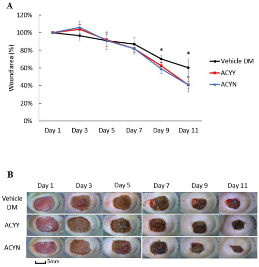 Wound healing after topical and/or oral Antrodia cinnamomea treatment on diabetic wounds. (A) Images of diabetic mice from diabetic vehicle control (Vehicle), combined topical and oral Antrodia cinnamomea treatment (ACYY) and topical Antrodia cinnamomea treatment alone (ACYN) on post-injury days are shown (B) Gross pictures from both combined topical and oral Antrodia cinnamomea treatment (ACYY) group and topical Antrodia cinnamomea treatment alone (ACYN) group of diabetic cutaneous wound from day 9 to day 11 in diabetic rats. Each value represents the mean ± SEM; n = 6 for each group. * p < 0.05 when treatment group compared to control group.