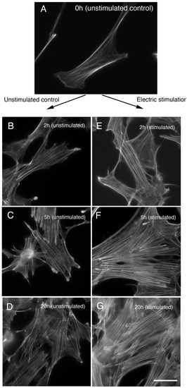 Figure 2A shows unstimulated control of cultured fibroblast stained with rhodamine-labeled phalloidin for the stress fiber detection. The stress fibers began to enlarge in size after 1 h of electrical stimulation, and then became thicker after about 2 h (Figure 2E). After 2–5 h of electrical stimulation (Figure 2E,F), the stress fibers were thicker and larger than in unstimulated controls (Figure 2B,C). After 5 h of electrical stimulation, stress fibers gradually increased in size and thickness (Figure 2F). After 20 h of electrical stimulation, the stress fibers showed increased thickness, but their number remained almost the same as at 2 h in a cell (compare Figure 2G for electrical stimulation and Figure 2D for unstimulated control for 20 h).