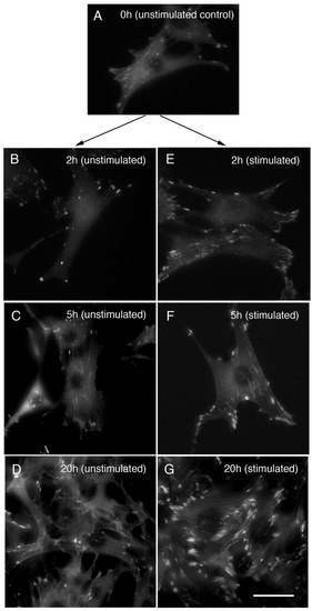 Next, the changes in focal adhesions after electrical stimulation were examined in cells stained with monoclonal anti-paxillin antibody and stimulated for 0 (unstimulated control; Figure 3A), 2, 5, or 20 h (Figure 3E–G). Unstimulated controls of cultured fibroblasts for 2, 5, 20 h were also shown (Figure 3B–D). The focal adhesions gradually became larger after 2, 5, or 20 h (Figure 3E–G) of electrical stimulation compared with unstimulated controls (Figure 3B–D). After 2 h of electrical stimulation, both focal adhesions (Figure 3E–G) and stress fibers (Figure 2E–G) were shown to have begun to increase in number and size. Both stress fibers and focal adhesions were thicker and after 20 h of periodic electrical stimulation compared to unstimulated controls (compare Figure 2G for the stress fibers and Figure 3G for the focal adhesions).