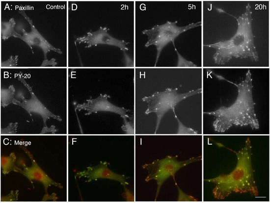 Figure 4 shows the increases in size of focal adhesions and accumulation of phosphotyrosine-containing proteins by electrical stimulation. Unstimulated control for 0 h is shown in Figure 4A–C. After 2 h of electrical stimulation of eGFP-paxillin-transfected cells, the focal adhesions began to increase in size after 2 h (Figure 4D), and gradually enlarged the size of focal adhesions after 5 h (Figure 4G) and 20 h (Figure 4J), and showed intense staining with anti-phosphotyrosine antibody (PY-20) after 2 h (Figure 4E), 5 h (Figure 4H), and 20 h (Figure K). Merged images of both eGFP-paxillin and anti-phosphotyrosine (PY-20) are shown in Figure 4C,F,I,L. Tyrosine-phosphorylated proteins were accumulated in focal adhesions revealed by eGFP-paxillin.