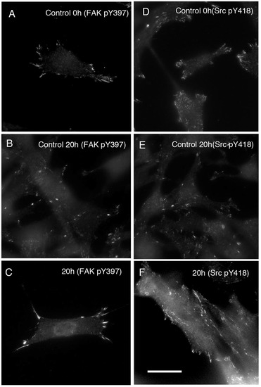 Figure 5 shows the results of staining for the active forms of FAK (pY397) and c-Src (pY418) in cells with periodic electrical stimulation. Cells stimulated for 20 h showed intense staining with anti-phospho-FAK (pY397) and anti-phospho-c-Src (pY418) antibodies in focal adhesions (Figure 5C,F, respectively).