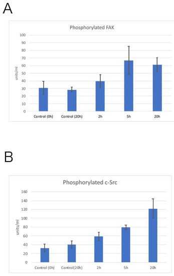 The level of tyrosine-phosphorylated FAK and tyrosine-phosphorylated c-Src was examined by ELISA experiments. The level of tyrosine-phosphorylated FAK was increased by about twofold at 5 h compared to controls and remained almost constant from 5 to 20 h (Figure 6A), while the level of tyrosine-phosphorylated c-Src was increased by about 3.7-fold compared to the control level at 20 h (Figure 6B). The level of tyrosine-phosphorylated FAK relative to the control (0 h; no electrical stimulation) was increased at 2 h, and maximum phosphorylation was detected after 5 h of electrical stimulation. On the other hand, the level of tyrosine-phosphorylated c-Src was increased after 2 h of electrical stimulation and showed a gradual linear increase until 20 h. These results indicate that electrical stimulation increased the level of tyrosine phosphorylation of both FAK and c-Src, reflecting the microscopic results. Phosphorylation levels of the unstimulated control (Control 0 h) or 20 h (Control 20 h) in both tyrosine-phosphorylated FAK and tyrosine-phosphorylated c-Src were almost the same.