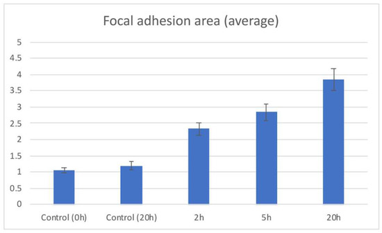 Quantification of focal adhesion area. The mean areas of focal adhesions are shown for the unstimulated control (Control 0 h), unstimulated control without electrical stimulation for 20 h (Control 20 h) 2, 5, and 20 h of electrical stimulation. Number of vertical bars is area of the focal adhesions (μm2). Error bars represent the SEM.