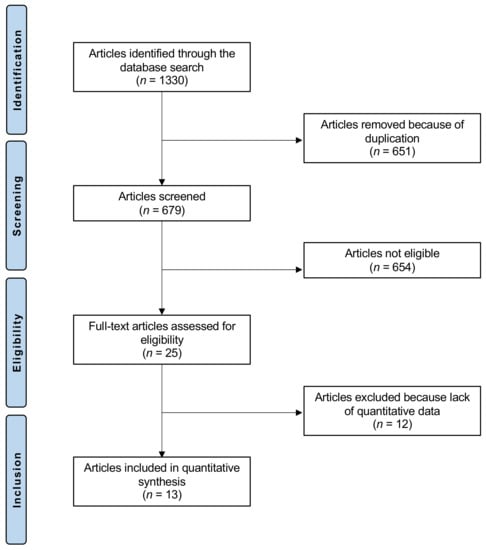 The initial literature search resulted in 1330 articles. Of these, 651 articles were removed because of redundancy, and 679 articles were screened for eligibility. Of them, 25 were comparative clinical studies which compared LSIs versus CTR. An additional 12 articles were excluded because they did not provide quantitative data on the outcomes of interest. Finally, 13 studies were included: 10 randomized, controlled trials, 1 prospective, and 2 retrospective studies. The literature search results are shown in Figure 1.
